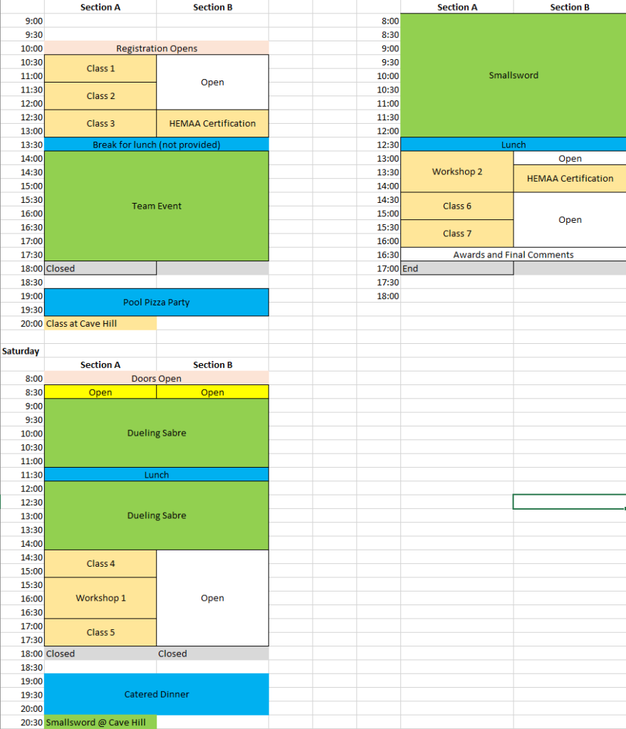 Schedule of Events and Classes Preliminary schedule subject to drastic changes and additions 🙂 The Team event will start Friday afternoon.The Saber tournament will start Saturday morningThe Smallsword tournament will start Sunday morningClasses and free sparring throughout the weekend!
